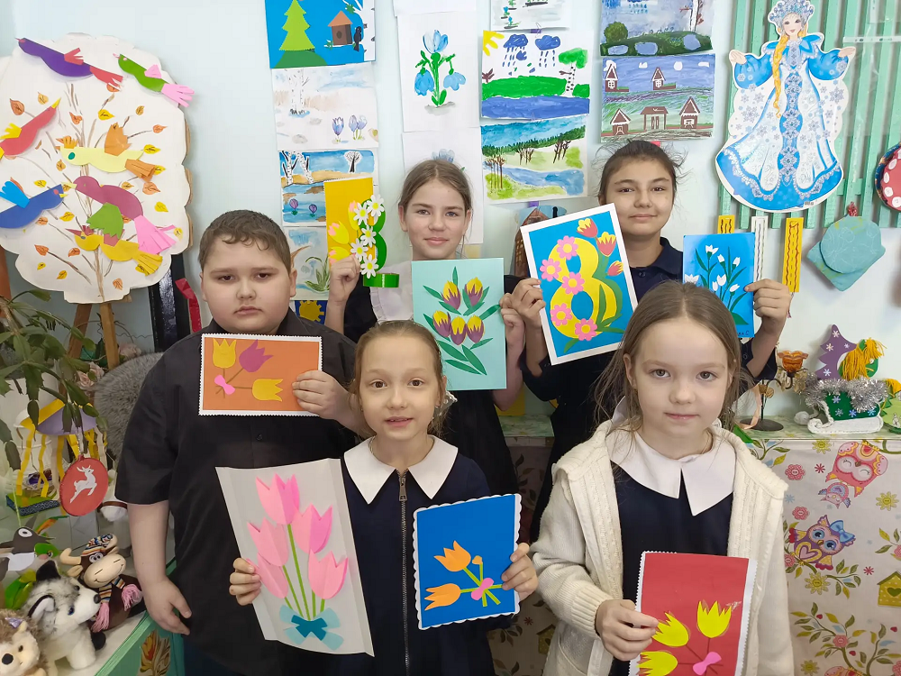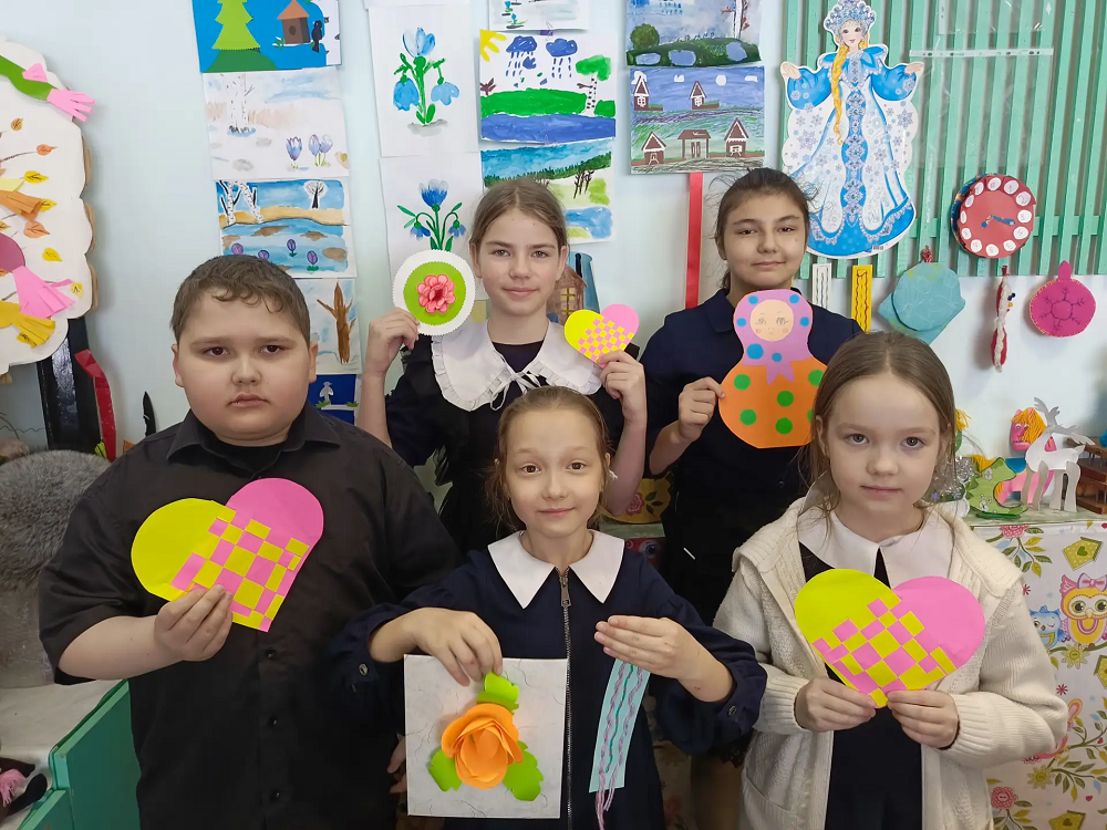 В марте обучающиеся объединения «Домовёнок» с. Подволошино изготовили динамические игрушки. В ходе занятия ребята узнали, почему игрушки называются динамическими, научились соединять подвижные детали изделия. К 8 марта изготовили открытки, поделки и аппликации для своих мам. Дети научились вырезать несколько деталей одновременно, составлять композицию из цветов, а также учились сочетать цвета между собой. Познакомились с видом переплетения и изготовили открытки в виде сердца.